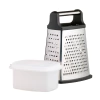 Este rallador viene con un recipiente de plástico especialmente diseñado que resuelve todos estos problemas. El recipiente se abre y se cierra en la parte inferior del rallador, por lo que todos los ingredientes rallados acaban dentro. El recipiente viene con una tapa hermética, para que pueda guardar los ingredientes sobrantes con toda confianza. El cierre hermético ayuda a mantenerlos frescos, por lo que puede guardarlos en el frigorífico para la próxima vez. 4 en 1 Rallar, rallar, rallar en tiras y cortar en rodajas Este rallador de caja tiene cuatro lados, cada uno con un tipo de cuchilla diferente: rallador fino, rallador medio, rallador grueso y cortador. Este ingenioso diseño multiusos le confiere innumerables usos en la cocina. Puede rallar parmesano para preparar un cremoso plato de pasta con su superficie de rallado fino, o rallar limas para una tarta de lima con la superficie media. La cuchilla gruesa es fantástica para rallar patatas y hacer rosti, mientras que la cuchilla de corte facilita el trabajo de cortar calabacines y zanahorias para ensaladas y salteados. Sin resbalones ni accidentes Para un rallado controlado cuando no esté utilizando el recipiente, también dispone de una base antideslizante, además de un mango de metal sólido que le ayuda a mantener un agarre firme. Esto hace que el rallado sea más rápido, cómodo y menos sucio. Información útil – El rallador de queso mide aprox. 11,5 x 12,5 x 23 cm – El recipiente mide aprox. 11,5 x 12,5 x 8 cm – El rallador es naturalmente resistente a los olores y al deslustre – Apto para lavavajillas.