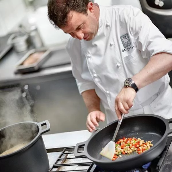 La cacerola baja Efficient reúne la eficacia y la calidad para un uso de cocina intensiva con los mejores resultados. Es una cacerola robusta y duradera gracias a su cuerpo fabricado en aluminio fundido y a la calidad de su antiadherente Platinum Plus libre de PFOA.