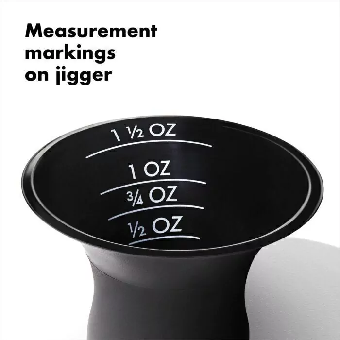 La tapa del jigger tiene marcas de medición, filtro incorporado