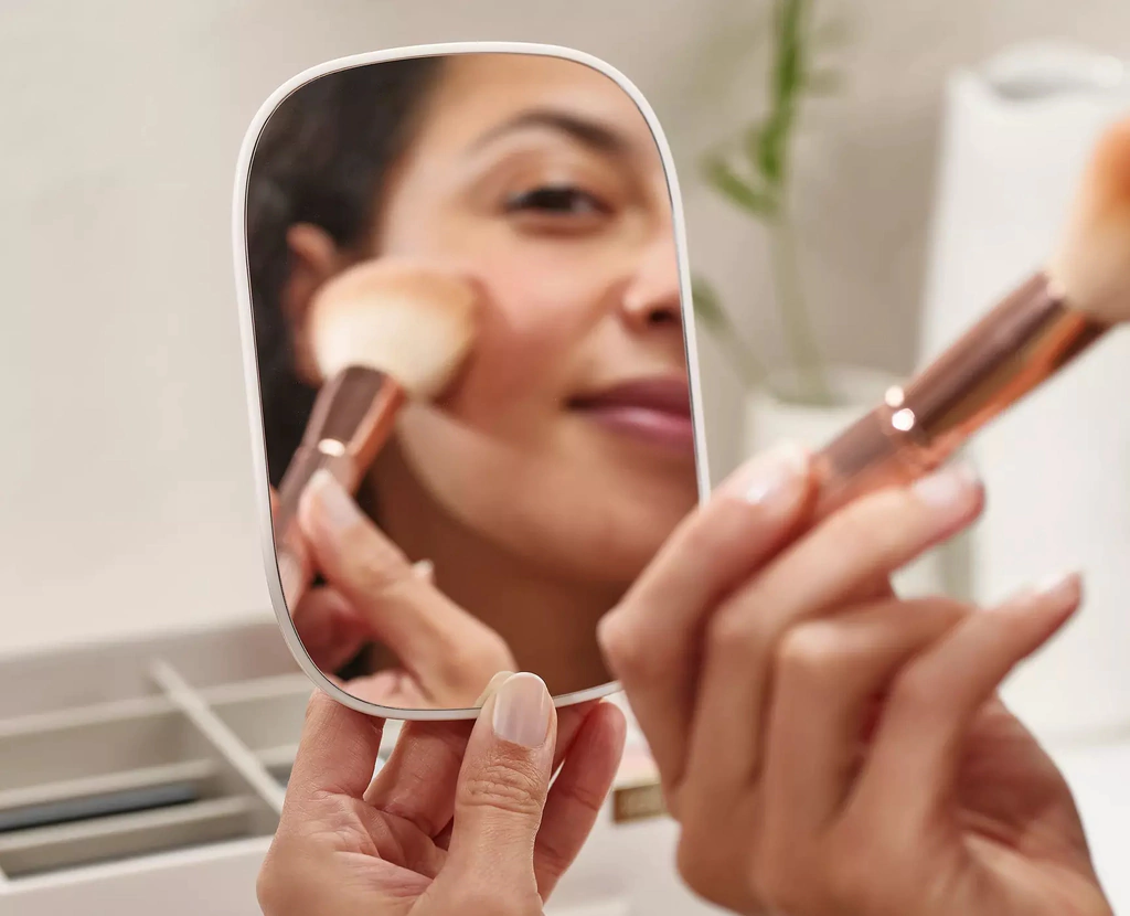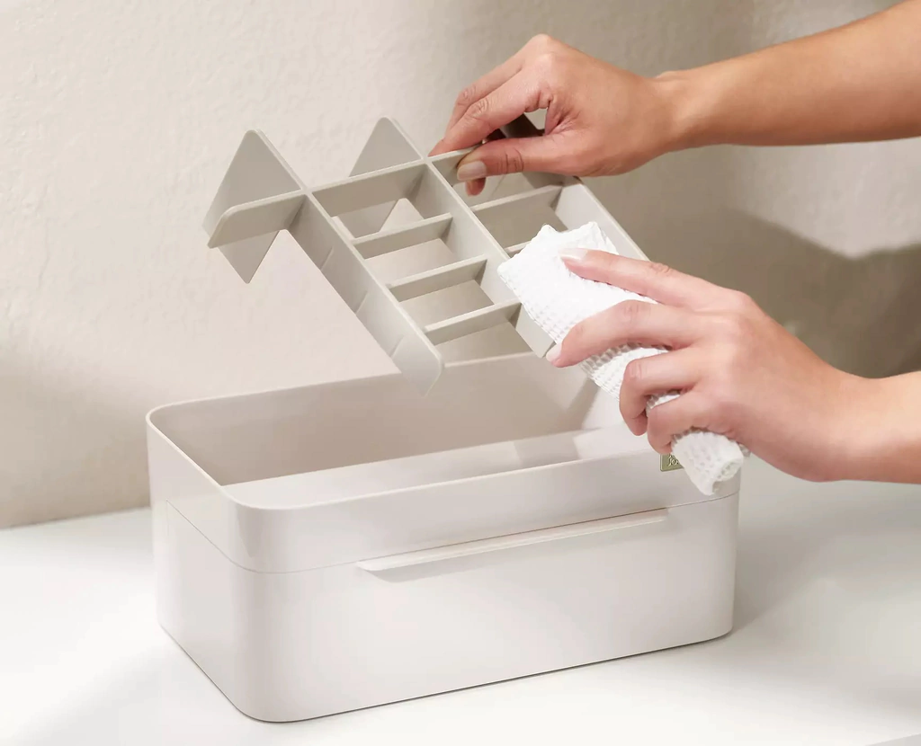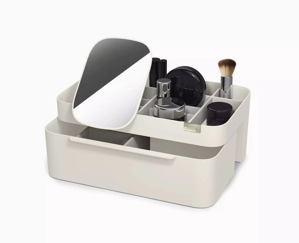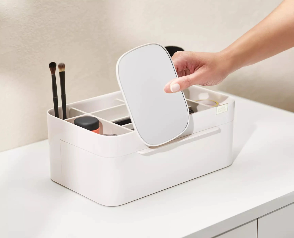 Esta elegante gama de organizadores de cosméticos tiene compartimentos más y menos profundos para guardar varios artículos como brochas, máscaras de pestañas y sombras de ojos, además de prácticos cajones para cosas como almohadillas y bastoncillos de algodón o esponjas de maquillaje. Cada cajón viene con una pestaña que facilita su apertura y un cierre magnético para que no se abra cuando está cerrado. El organizador grande tiene un espejo extraíble 2 en 1 que se puede montar en el borde de la unidad de forma que puede usarse sin manos y se guarda en una ranura en la parte posterior tras su uso. El ángulo del espejo se puede regular fácilmente y cuenta con un espejo de 3 aumentos en la parte trasera para más precisión. Todos los organizadores Viva están acabados con un elegante detalle cromado y disponen de divisores extraíbles que facilitan su limpieza.